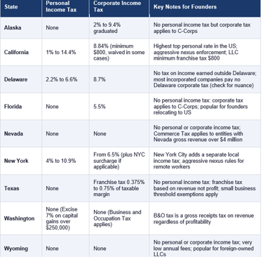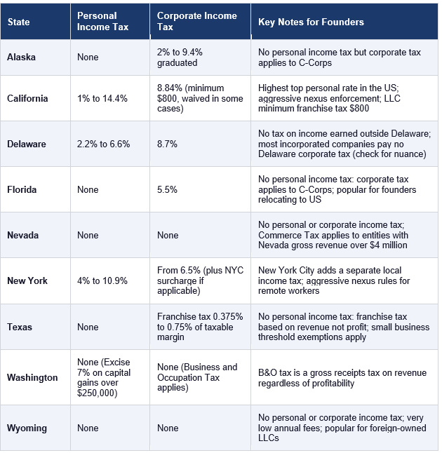 Nine states currently impose no personal income tax: Alaska, Florida, Nevada, New Hampshire (which taxes only interest and dividends, with that tax being phased out), South Dakota, Tennessee (which similarly taxed only investment income, now eliminated), Texas, Washington (which taxes capital gains above a threshold but not ordinary income), and Wyoming. For non-US founders who establish a US physical presence and become US tax residents, choosing to locate in one of these states eliminates the state personal income tax layer entirely.
