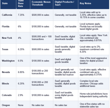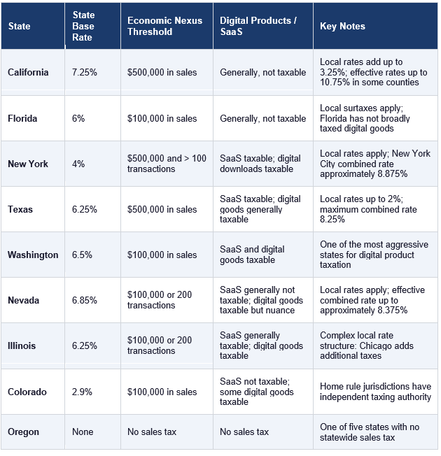 The following table covers the states most likely to be relevant for non-US founders selling digital products, SaaS, or physical goods to US customers. Rates shown are state base rates; local rates are added on top and vary by jurisdiction. Economic nexus thresholds and digital product taxability rules change frequently; confirm current rules with a sales tax professional or automation platform before relying on this table.