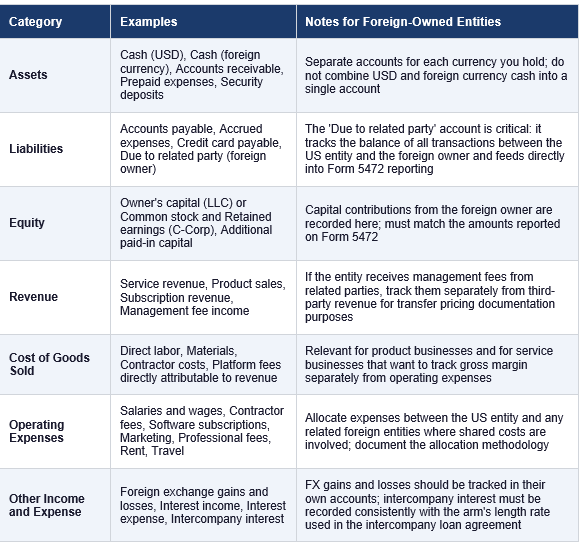 For a foreign-owned US entity, the chart of accounts needs to do several things that a standard domestic template does not address: it needs to track intercompany transactions separately, handle multiple currencies, and produce information that directly supports Form 5472 reporting.