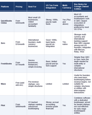 The two most important questions are: does the software handle multi-currency transactions properly, and does it integrate with the banking platforms that foreign-owned entities typically use, specifically Mercury, Relay, and Wise. Secondary considerations are the software's familiarity to US accountants and tax preparers, its 1099 contractor payment tracking capability, and its payroll integration options.