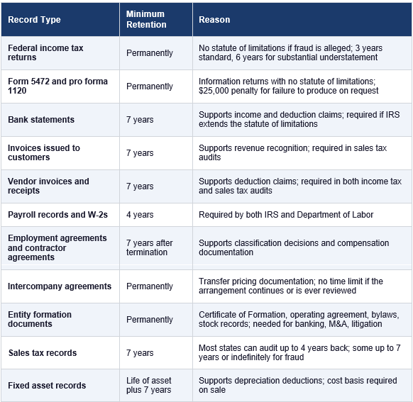 If the IRS examines your return or a state revenue agency conducts a sales tax audit, they will issue document requests specifying what they want to see and the time frame in which you must respond. The ability to respond promptly with organized, complete records significantly reduces the time and cost of an audit. An audit that requires weeks of record reconstruction from bank statements, email threads, and fragmented files takes far longer and costs far more in professional fees than one where the records are ready to produce.