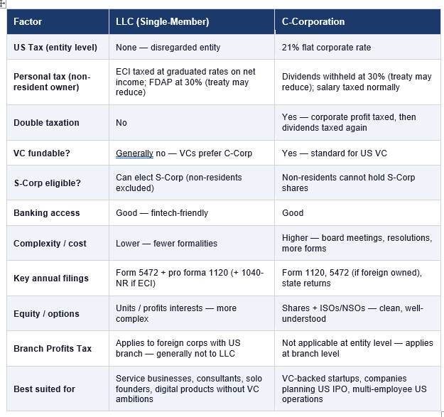 The most common mistake is forming an LLC because someone else said to, or forming a C-Corp because that is what appeared first in a search, without understanding the tax implications of the choice. The entity decision should be driven by your specific circumstances so your home country, your income type, your hiring plans, your funding plans, and your extraction strategy. Defaulting to either option without working through those factors is how founders end up with structures that are inefficient or actively wrong for their situation.